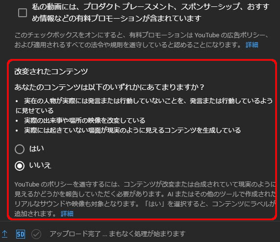 これは3月の終わりごろからの話になります。動画を投稿されている方ならもうご存知だと思いますが、YouTubeに動画を投稿する際、コンテンツが改変または合成されて現実のように見えるかの報告が必要になりました。