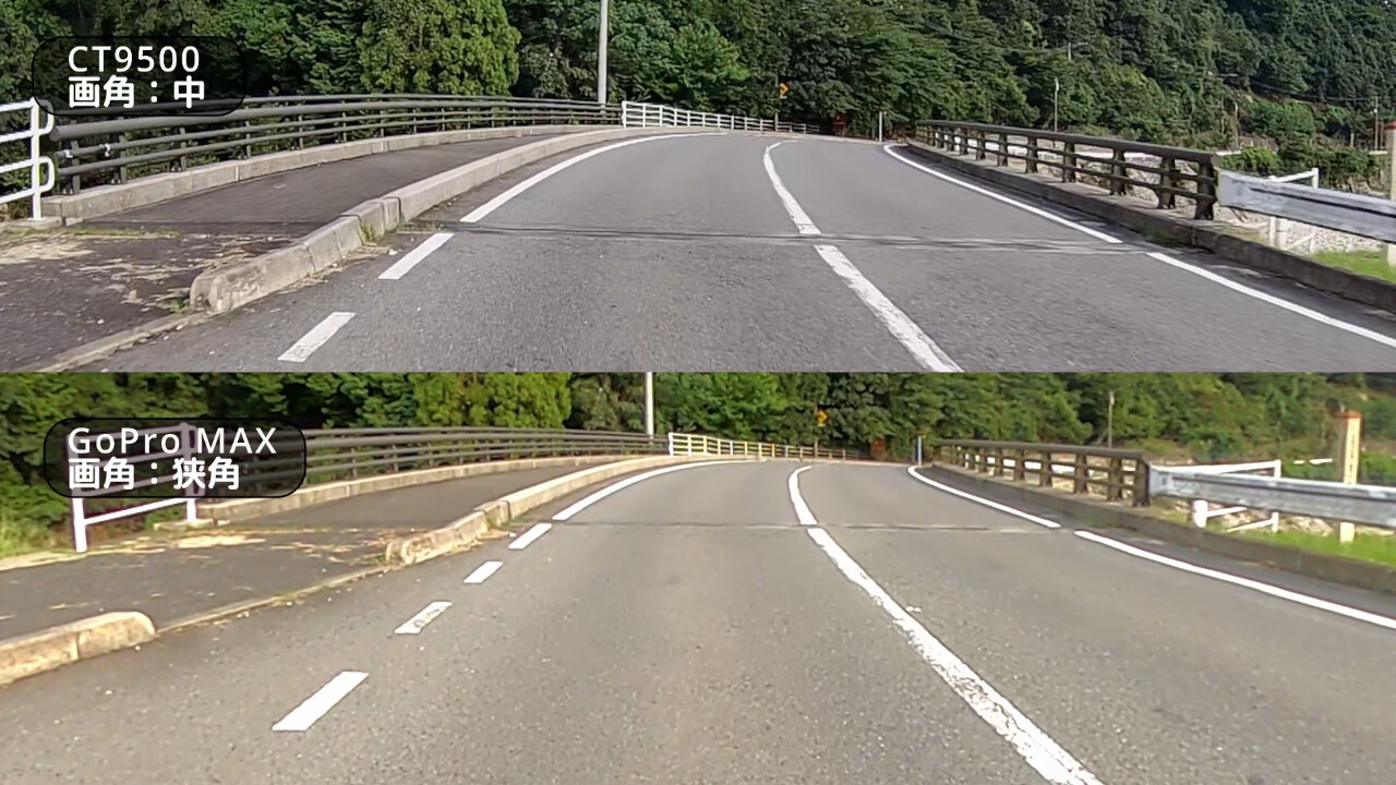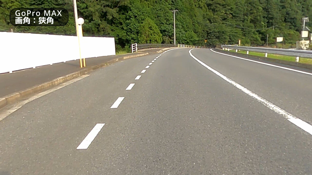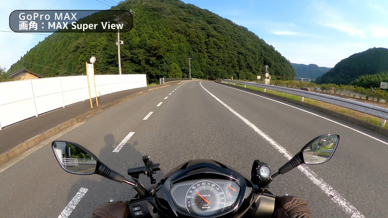 遠近感がガッツリ変わってきてるのが分かると思います。広角と Max SuperView ではバイクのフロント部分が写り込んできてますね。このくらいの画角の広さでバイクが写っていればバイクに乗ってる感が出て良さげです。